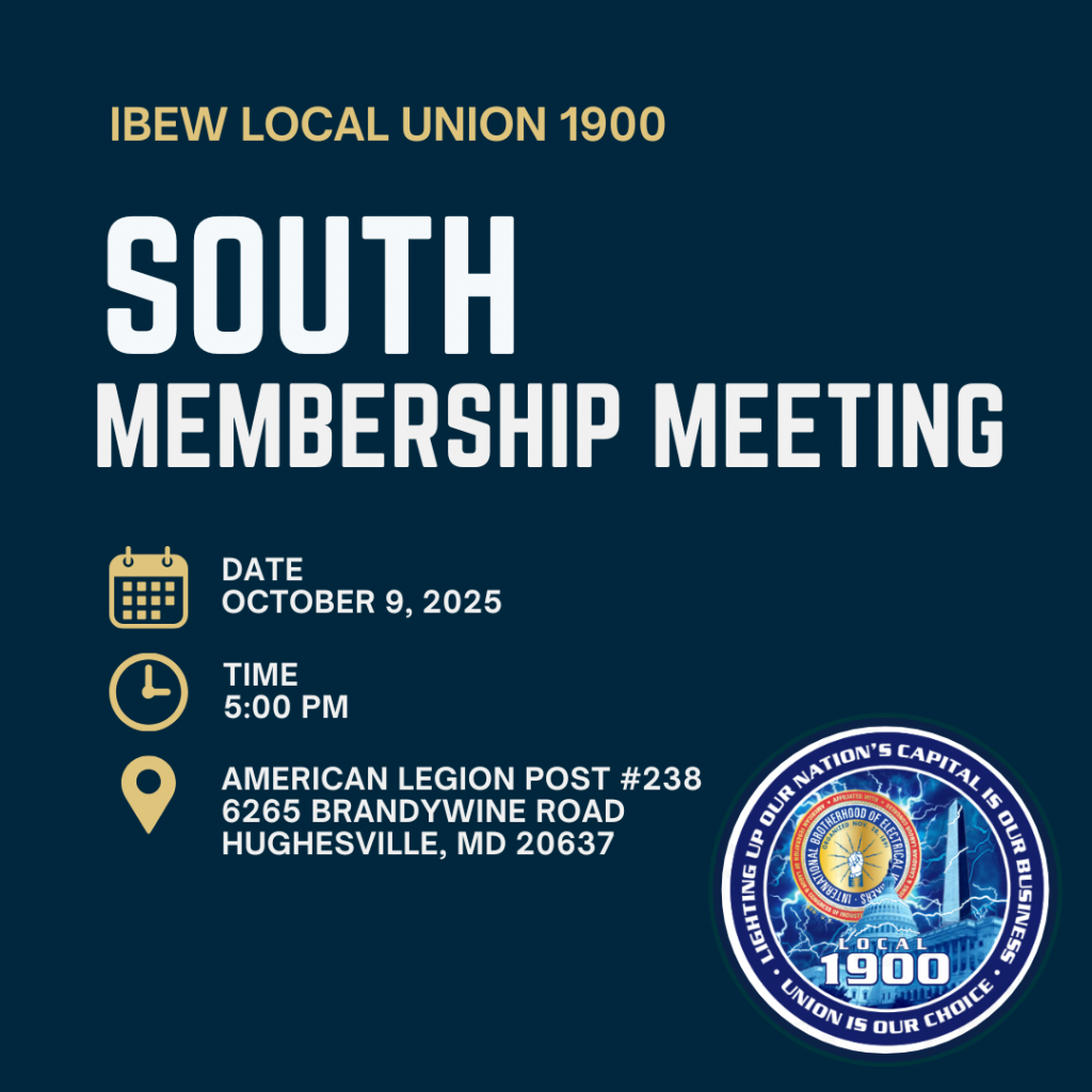 The South Union Membership Meeting is today, Thursday, October 9, 2025, at 5:00 PM in Hughesville. If you have any questions, please contact the union hall at cialis nhs (301) 322-6030.