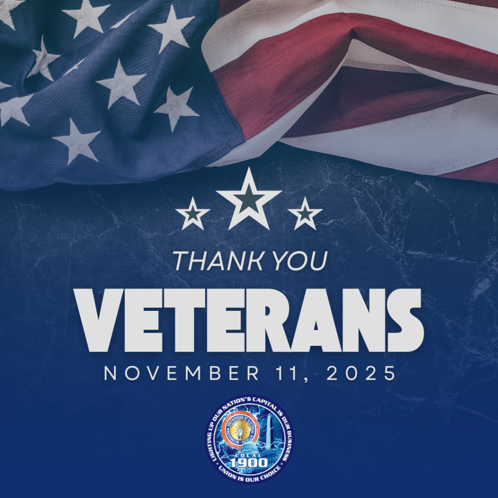We especially honor the veterans within our IBEW Local 1900 membership. The same commitment to excellence and service that guided them in uniform continues to strengthen our union and the communities we serve every day.